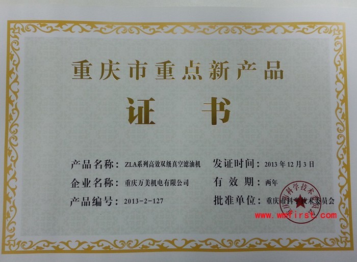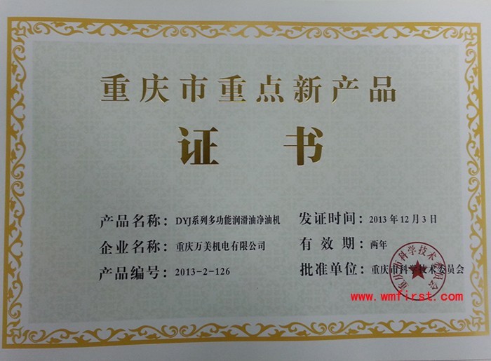熱烈祝賀,我公司的“DYJ系列多功能潤滑油凈油機(jī)”、“ZLA系列高效雙級真空濾油機(jī)”經(jīng)重慶市科學(xué)技術(shù)委員會相關(guān)專家的鑒定,榮獲重慶市科學(xué)技術(shù)委員會頒發(fā)的重慶市重點(diǎn)新產(chǎn)品證書。而在此之前,我公司的這兩個(gè)系列的凈油機(jī)(濾油機(jī))就已是專利及高新技術(shù)產(chǎn)品。此外,我公司還有多款濾油機(jī)擁有專利和高新技術(shù)產(chǎn)品稱號。