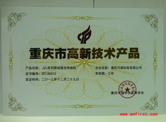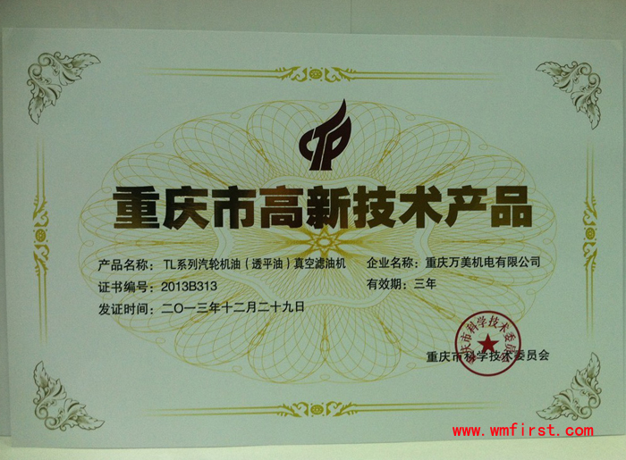 暨上次“DYJ系列多功能潤(rùn)滑油凈油機(jī)”和“ZLA系列高效雙級(jí)真空濾油機(jī)”獲重慶市科學(xué)技術(shù)委員會(huì)頒發(fā)的重慶市重點(diǎn)新產(chǎn)品證書之后,我公司的兩項(xiàng)真空濾油機(jī):JZJ系列聚結(jié)真空凈油機(jī)(濾油機(jī))和TL系列汽輪機(jī)油(透平油)真空濾油機(jī)獲重慶市科學(xué)技術(shù)委員會(huì)授予的高新技術(shù)產(chǎn)品稱號(hào)!